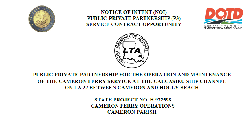 On August 25, 2025, DOTD received (on behalf of LTA) an unsolicited proposal for Cameron Ferry Service Operations from LabMar Ferry Services, LLC (LFS) along with a $10,000 unsolicited proposal fee. LFS concurrently submitted a copy of its unsolicited proposal to Affected Local Jurisdiction, Cameron Parish Police Jury, and the local port, Cameron Parish Port, Harbor, and Terminal District. LFS is currently the operator of the New Orleans Regional Transit Authority’s (RTA) ferry system. LFS operates and maintains the system, including assisting with the delivery of two new passenger ferries in 2020.