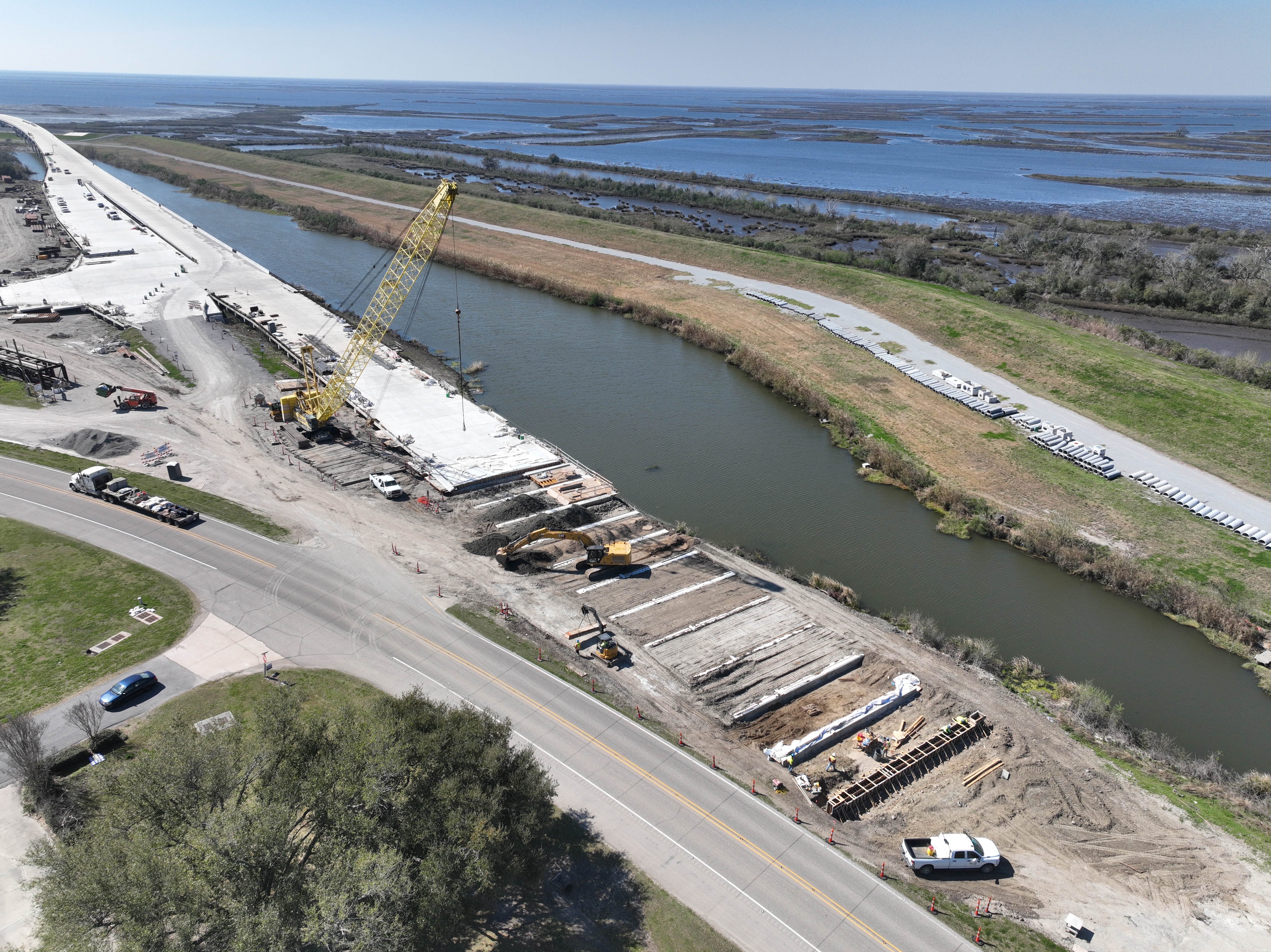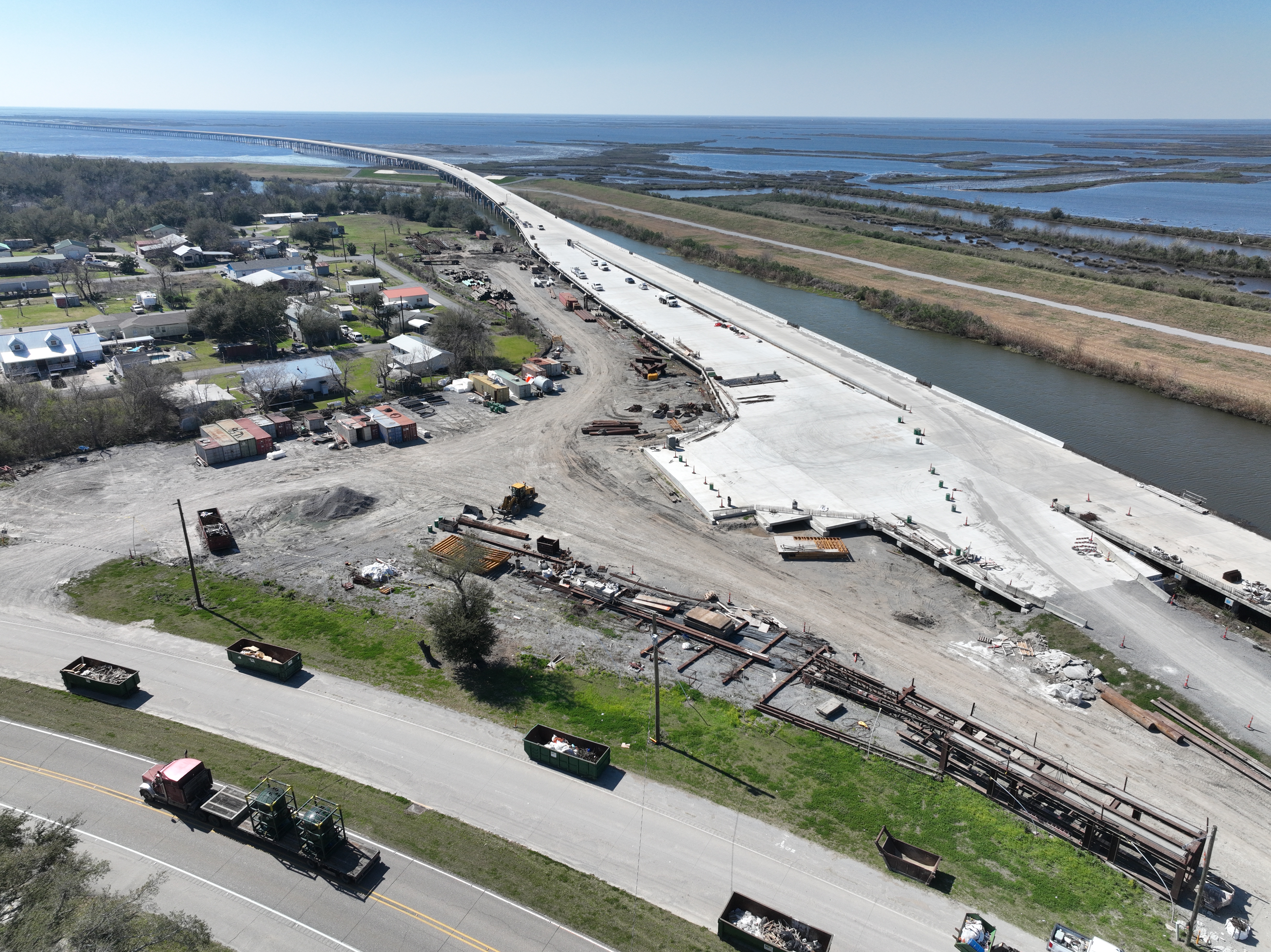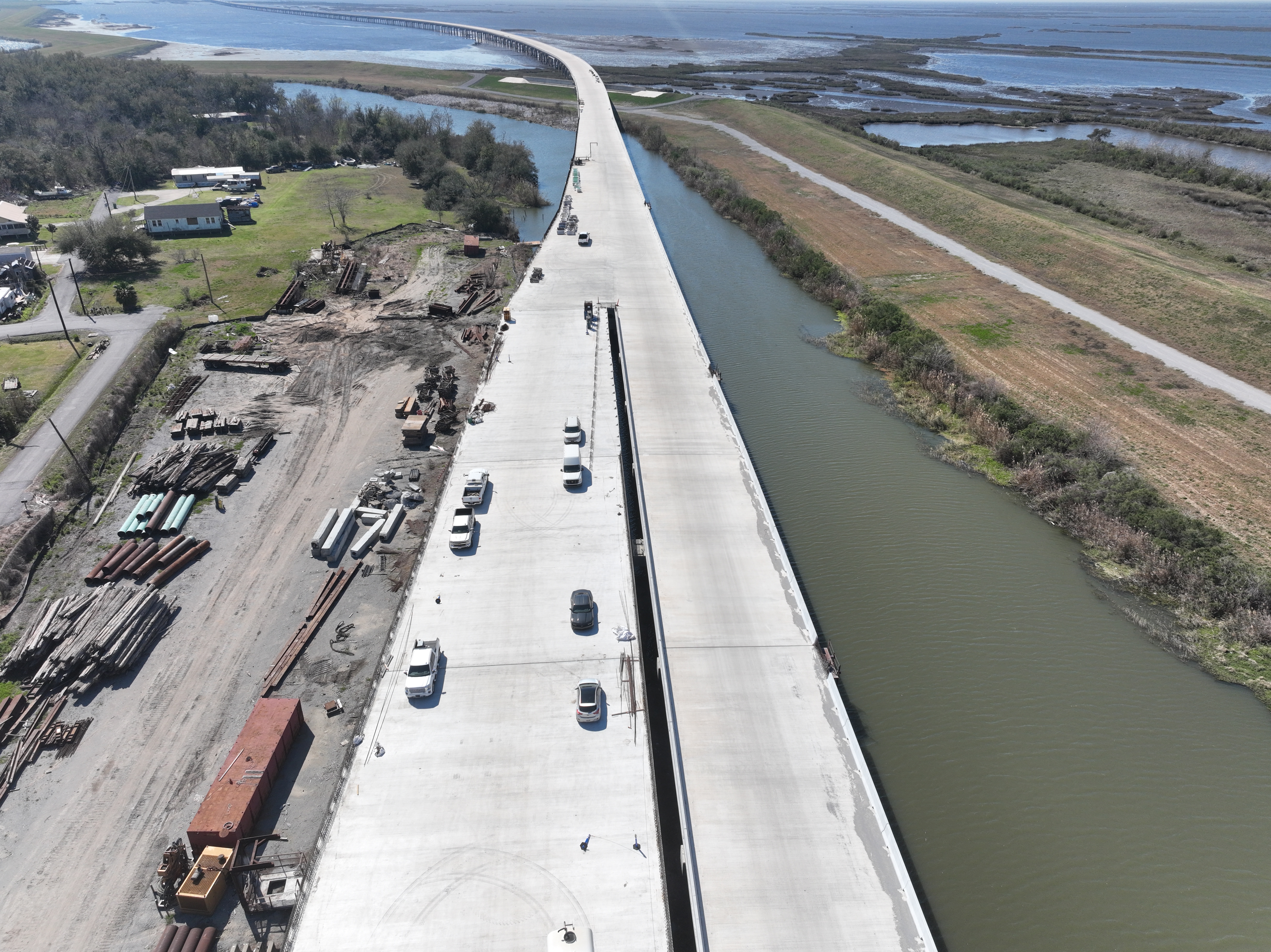Construction is underway with LA 1 Phase 2 to expand the elevated highway an additional eight miles from Golden Meadow. LA 1 Phase 2 will replace the existing low-lying roadway, often overtopped and damaged during storm events. This expansion will provide a more convenient evacuation route during hurricane and flooding events, a more reliable shipping route, and increased accessibility opportunities for tourism. This project is expected to be completed in 2027 and will be transferred to Lafourche Parish.